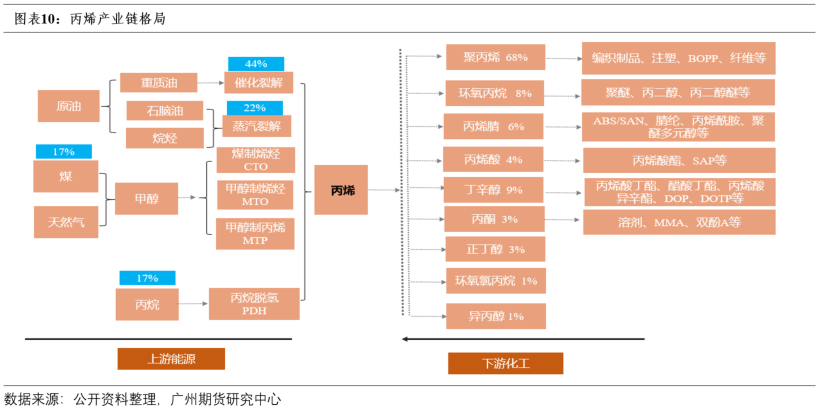 从需求端分析,聚丙烯是丙烯最大的下游应用产品,占比68%,广泛应用于塑料制品、膜材以及纤维等多个领域,例如塑料容器、塑料薄膜、纤维制品等。丁辛醇的占比约为9%,主要用于生产增塑剂、溶剂、脱水剂、消泡剂、分散剂、浮选剂、石油添加剂以及合成香料等多种化学品。环氧丙烷占比接近8%,其主要用于合成聚醚多元醇,进而与TDI/MDI发生反应,进一步合成聚氨酯高分子材料,该材料在软体家具、汽车、冰箱冷柜、建筑保温材料以及防水涂料等领域有着广泛应用,同时环氧丙烷也可用于生产表面活性剂、润滑剂等行业产品。丙烯腈占比约为6%,它是合成塑料、橡胶、纤维等高聚物的重要原料,可用于生产腈纶、ABS树脂、丙烯酰胺等化工产品。