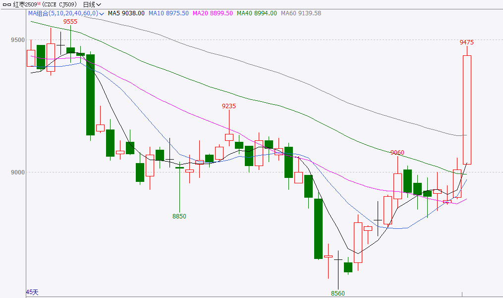 今日郑州红枣期货价格出现较大幅度上涨,截至今日收盘红枣主力CJ2509合约报9440元/吨,日上涨440元/吨,涨幅4.89%。
