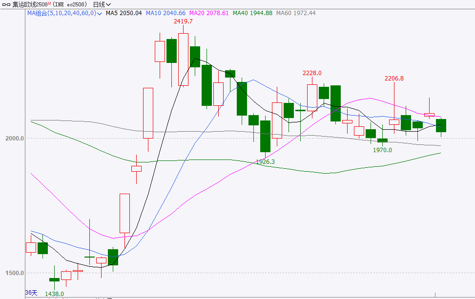 今日主力EC2508合约几乎将昨日的涨幅尽数回吐,最终收于2022.2点,与前一交易日相比下跌了4.01%。