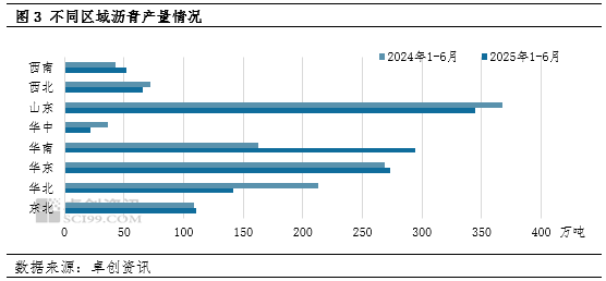 虽然地方炼厂沥青产量同比增加,但其实地方炼厂分布相对集中的华北、山东地区沥青产量却呈现同比下降趋势,下降幅度分别为33%和6%;而华南地区沥青产量同比增幅达到81%,主要因为京博海南沥青的持续生产,这也是地方炼厂沥青产量整体增加的主要原因;其他地区沥青产量变动幅度不大。