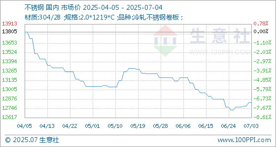 7月4日生意社不锈钢基准价为12825.00元/吨