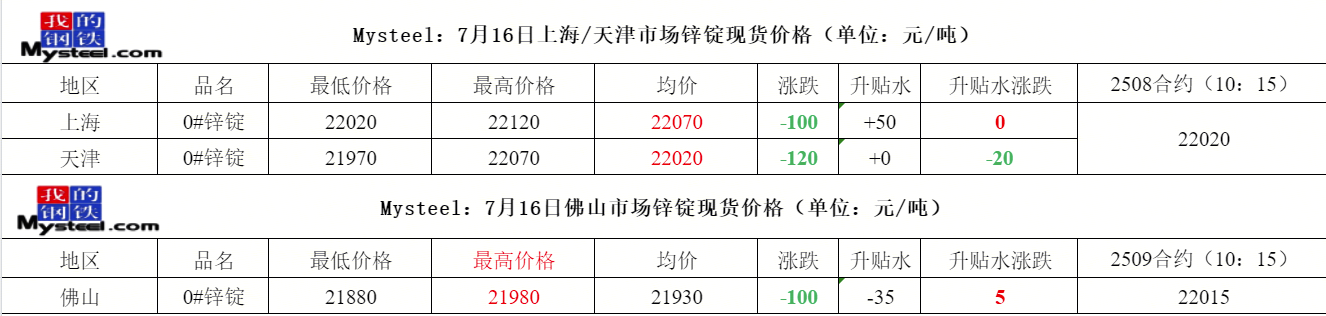 价格:7月16日广东市场0#普通电解锌现货对沪锌2509合约贴水35元/吨,升贴水较前一日上涨5元/吨,报价21980元/吨,较上一个交易日下跌100元/吨。国产品牌报价多集中于对沪锌2508合约贴水45-65元/吨附近。0#麒麟锌锭报价对沪锌2508合约贴水45元/吨附近,安宁锌锭报价对沪锌2508合约贴水65元/吨附近有成交。