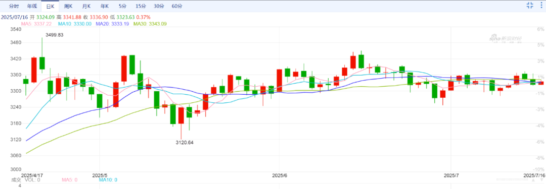美国6月消费者物价指数(CPI)同比增长2.7%,符合预期,但高于5月的2.4%。美国6月CPI环比增长0.3%,与市场预期一致,但高于前值0.1%,为今年1月以来最大增幅,美国6月核心CPI同比增长2.9%,高于预期和前值。美国6月通胀数据如期反弹,这一现象或表明特朗普关税政策对通胀的影响正逐步显现,使得美联储在货币政策上继续保持谨慎态度。在该数据公布后,国际现货黄金价格承压回落,并跌破3350美元/盎司关口。