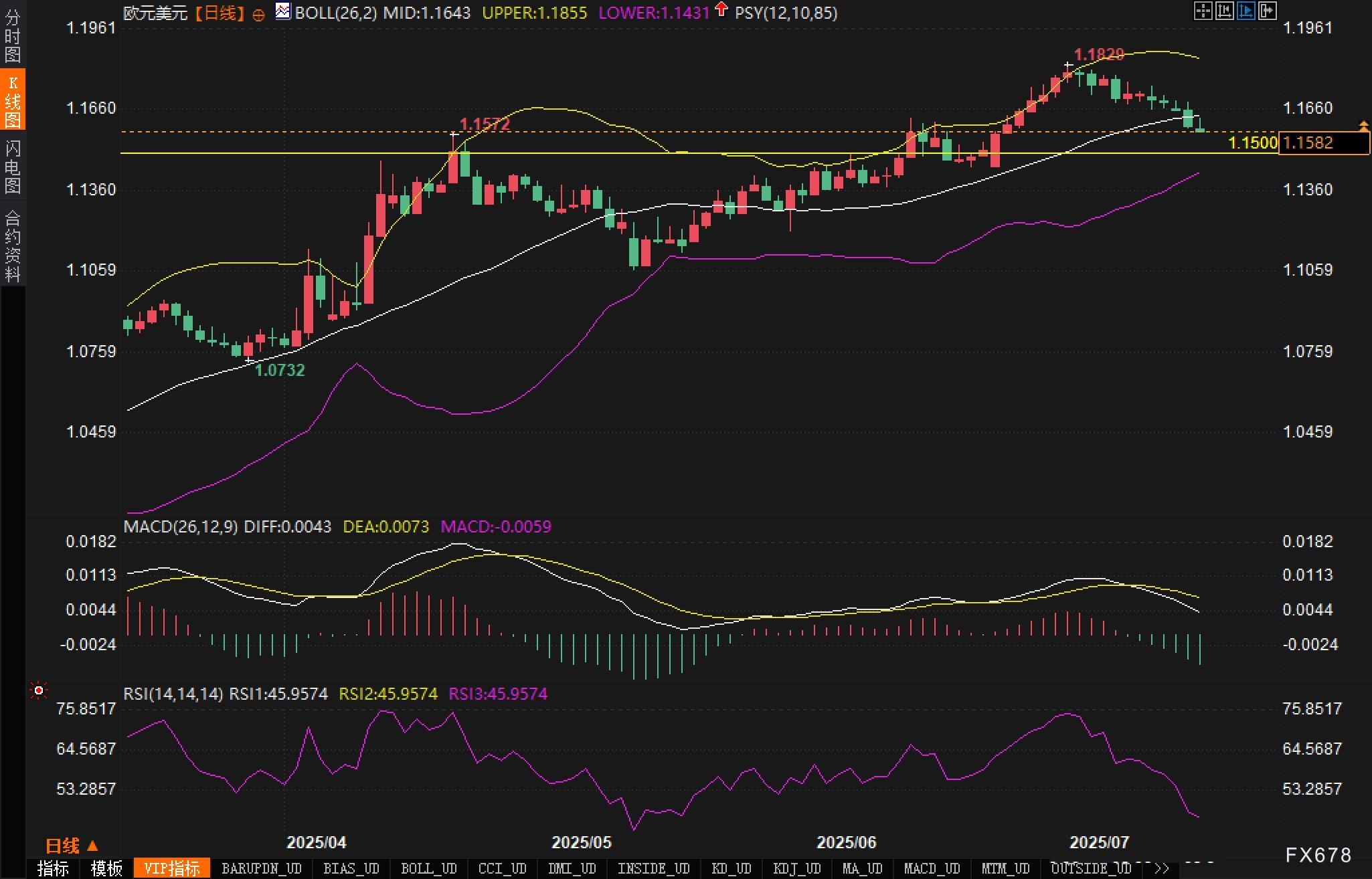 MACD指标死叉运行,MACD柱状图连续放大绿柱,显示空头动能在逐步增强;分析认为短期支撑位于1.1500整数关口,一旦跌破,或引发进一步技术性抛盘;