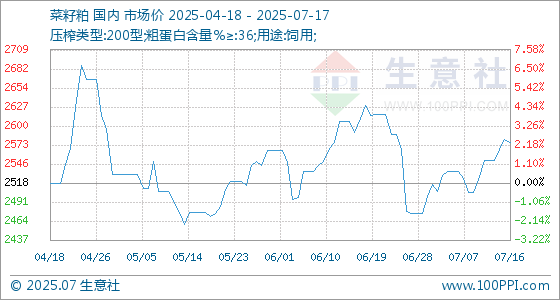 7月17日,生意社菜籽粕基准价为2576.67元/吨,与本月初(2500.00元/吨)相比,上涨了3.07%。
