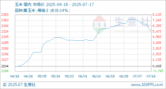 7月17日,生意社玉米基准价为2327.14元/吨,与本月初(2357.14元/吨)相比,下降了1.27%。