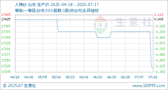 7月17日生意社人棉纱基准价为17225.00元/吨