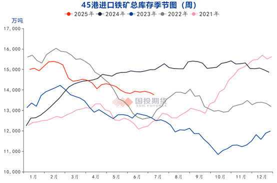 受海外发运偏弱以及国内铁水维持高位的影响,上半年铁矿石港口库存去化较为明显。尽管当前港口库存绝对量依然不低,但相较去年末至今年初的高位峰值相比,其供应压力已出现明显的缓解。并且如果考虑到偏低的压港量和钢厂库存,则全口径铁元素库存的实际压力并不大。展望未来,国内铁水产量虽已见顶回落但仍具韧性,叠加海外供应增量虽逐步兑现但短期放量幅度有限,双重因素制约下,我们预计港口库存继续去化的动能不足,但同时也没有太大的累库压力,短期可能以震荡为主,显著的累库压力还需等到四季度。