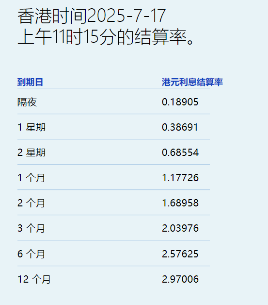 港元拆息普遍向上一个月期连升两日报1.17726%