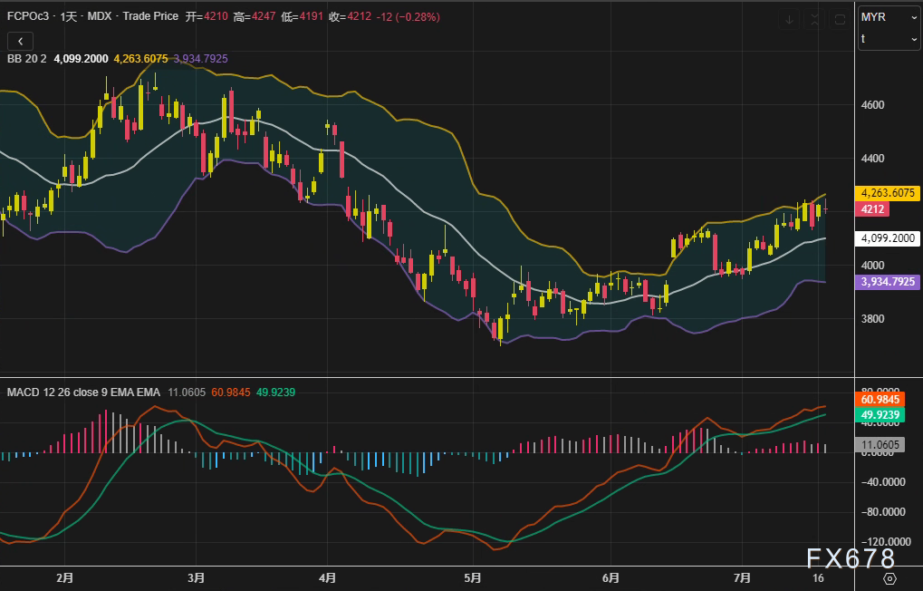 汇通财经APP讯——周四(7月17日),马来西亚衍生品交易所(BMD)棕榈油主力合约FCPOc3收于4212林吉特/吨,日内下跌12林吉特(0.28%),技术面显示布林带中轨位于4099点,MACD柱状线持续收窄,短期动能有所减弱。市场在7月上半月出口数据不及预期的打压下回吐前一日涨幅,尽管连盘棕榈油及美豆油走强提供一定支撑。