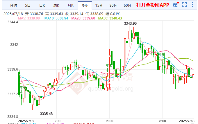 周五(7月18日)亚市早盘,现货黄金延续跌势,美国零售销售数据好于预期进一步施压金价。该数据强化了美联储的立场,即在通胀信号更明确前维持利率不变。截至发稿金价最新报3338.73美元/盎司,跌幅0.01%,最高上探3343.90美元/盎司,最低触及3336.69美元/盎司。