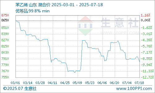 据生意社商品分析系统,本周苯乙烯市场震荡走跌,周初均价7936元/吨,周末均价7846元/吨,周内跌幅1.13%。