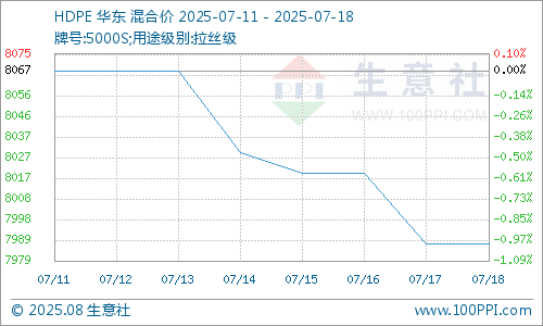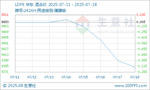 据生意社商品行情分析系统监测,LLDPE(7042)7月11日均价7416元/吨,7月18日均价在7378元/吨,下跌0.52%。LDPE(2426H)7月11日均价9493元/吨,7月18日均价在9383元/吨,下跌1.16%。HDPE(2426H)7月11日均价8067元/吨,7月18日均价在7987元/吨,下跌0.99%。