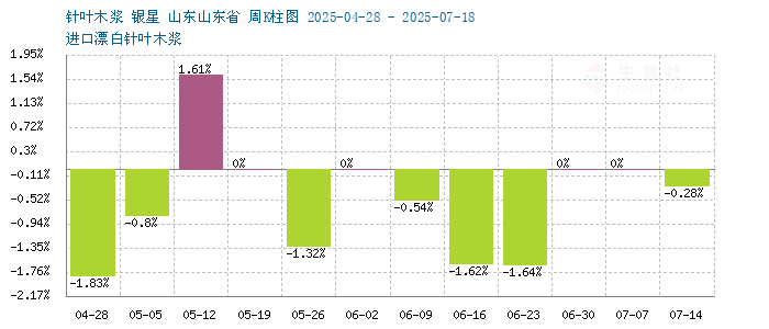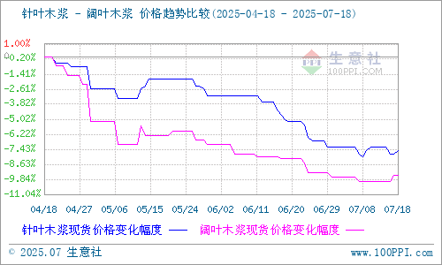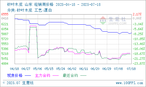 据生意社商品行情分析系统监测:本周针叶木浆价格涨跌互现,阔叶木浆则小幅上行。7月18日针叶木浆山东地区市场均价为5933.33元/吨,与7月13日均价相比下降了0.28%。7月18日阔叶木浆山东地区市场均价为4056.67元/吨,与7月13日均价相比上涨了0.58%。