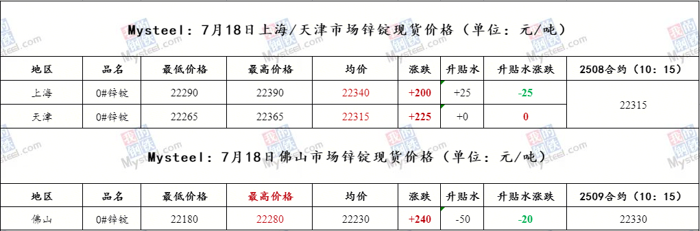 价格:7月18日天津地区:普通国产品牌现货成交价22315元/吨,较上一个交易上涨225元/吨。0#紫金对沪锌2508合约贴水10元/吨至升水10元/吨附近;驰宏、新紫等普通品牌对沪锌2508合约贴水30元/吨至贴水10元/吨附近。0#紫金在22200元/吨~22400元/吨附近有成交。