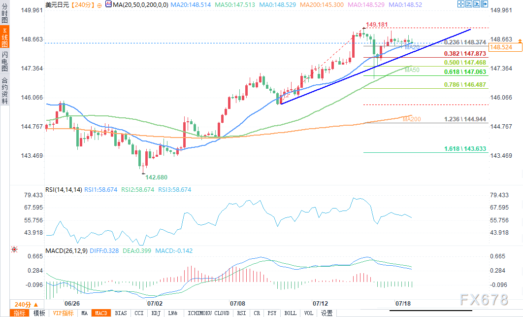 汇通财经APP讯——周五(7月18日)欧盘时段,美元/日元的价格在区间内波动。日内价格最低下探到了接近148.288附近,而最高则触及到了148.914附近,波动幅度相对较为明显。整体市场情绪相对平稳。多方在午后发力使得价格上升,但晚间又出现一定回调,多空双方力量博弈较为激烈。