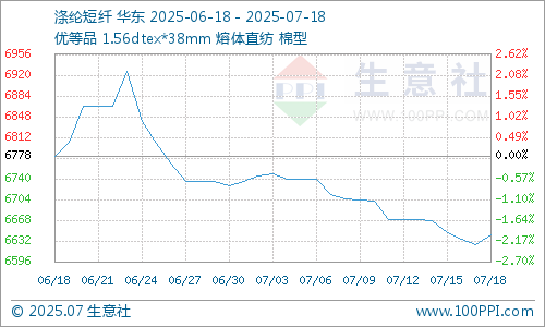 据生意社商品行情分析系统,本周国内(7月14-18日)涤纶短纤价格呈现走弱态势,截止7月18日,国内涤纶短纤(1.4D*38mm)市场均价在6643元/吨,较周初下跌0.36%。