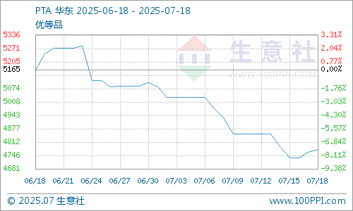 PTA市场整体维持偏弱走势,截止7月19日华东地区PTA市场均价在4776元/吨,较周初下跌0.28%,后半周受原油提振价格小幅上行。供应维持稳定,装置无新的变化,行业整体开工率在80%附近。其中逸盛海南200万吨装置7月1日因故降负,7月6日提负中,6月份福海创450万吨、东营威联250万吨装置仍在停车中。