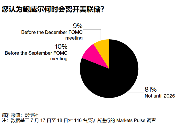 近期特朗普及其盟友对鲍威尔的攻击明显升级,以美联储总部翻修成本超支为由,持续施压要求其辞职。鲍威尔则回应称,若非特朗普的关税政策增加经济不确定性,美联储本可在今年更早启动降息。尽管多数华尔街人士认为,特朗普“因故解雇”鲍威尔面临法律障碍(博彩市场Polymarket显示其2025年离职概率仅22%,较上周18%小幅上升),但调查显示,多数受访者仍预期鲍威尔将完成任期至明年5月。