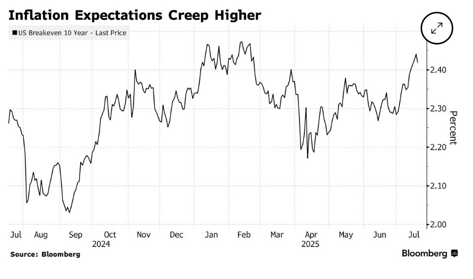 不过,美国银行利率策略师梅根.斯威伯认为,“陡化交易”对冲效果可能受限,因财政部或通过控制长期债券发行量来抑制收益率上行(7月30日将公布下一季度再融资计划)。她更推荐“盈亏平衡利率”策略(即普通国债与通胀保值债券收益率之差),认为这是“更干净”的对冲工具,可有效捕捉鸽派美联储政策推高通胀的潜在风险。目前,反映市场通胀预期的10年期盈亏平衡利率已升至2.42%,接近2月以来最高水平,显示投资者正为美联储独立性风险定价。