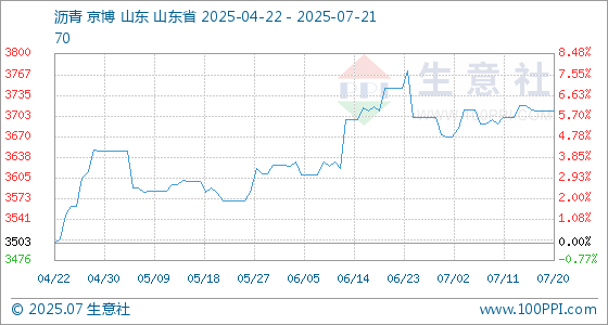 7月21日,生意社沥青基准价为3710.00元/吨,与本月初(3673.33元/吨)相比,上涨了1.00%。