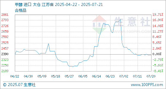 7月21日,生意社甲醇基准价为2383.33元/吨,与本月初(2805.00元/吨)相比,下降了15.03%。