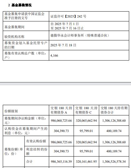募集期间净认购金额1,306,126,388.60元,认购资金在募集期间产生的利息400,189.74元,募集份额合计1,306,526,578.34份。