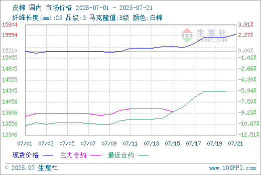 国内棉花现货库存缓慢减少,供应端挺价心态增强,现货跟随郑棉上调报价,市场价格重心稳步上涨。据生意社商品行情分析系统,截至7月21日3128B级皮棉现货价格在15596元/吨,较上周上涨1.85%。期货方面,上周郑棉一改此前震荡走势,主力合约攀升至14000以上,结束两个多月的震荡盘整,开启强势上涨模式,棉花现货价格也随着期货上涨。
