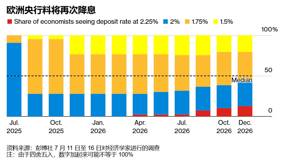 彭博经济预测认为,欧洲央行正处观望状态,最终可能在9月和12月进一步降息。预计7月24日会议后的政策表述将与6月保持一致,既为降息留有余地又避免承诺。