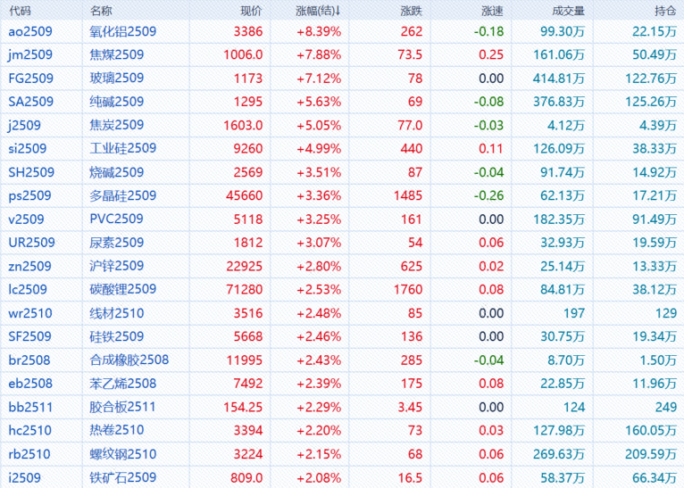 7月21日,午盘收盘,国内期货主力合约大面积飘红,氧化铝涨超8%,焦煤、玻璃涨超7%,纯碱、焦炭涨超5%,工业硅涨超4%,烧碱、PVC、多晶硅、尿素涨超3%;跌幅方面,集运欧线跌超2%。