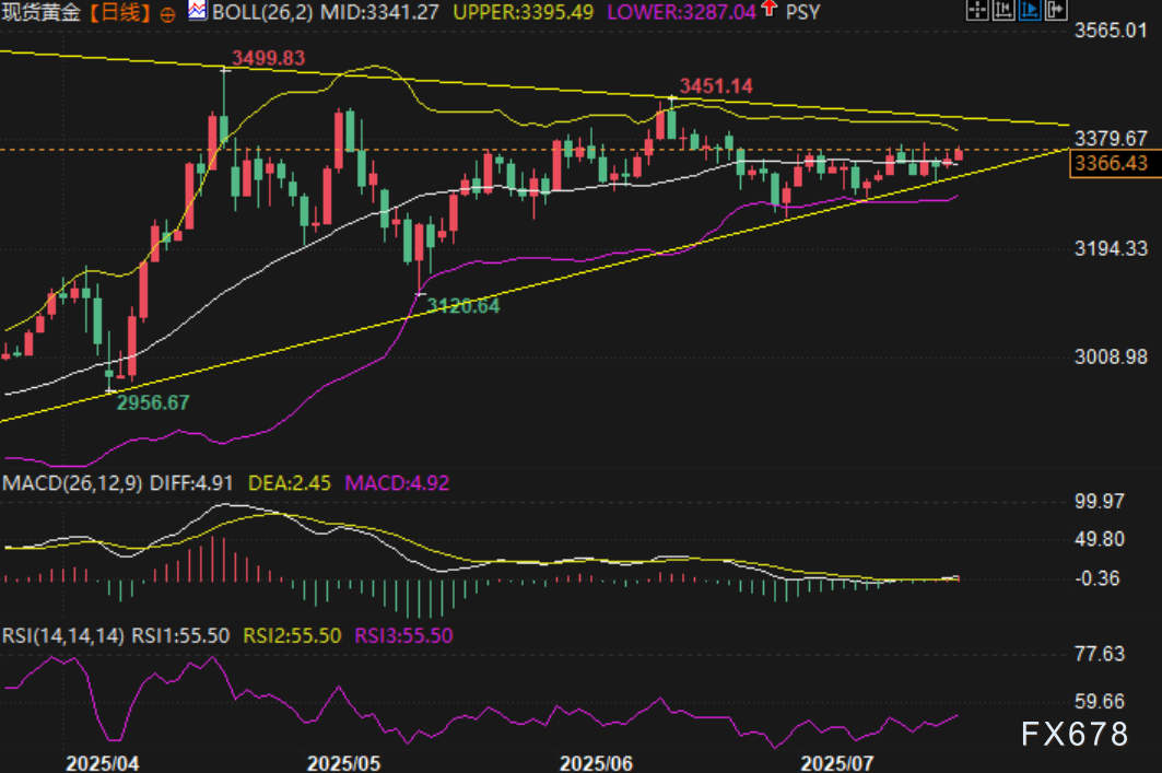 分析认为价格短期支撑位关注3287附近(布林下轨、上升趋势线),若失守,或测试3194、3120一线;上方阻力关注3395(布林上轨)、3451(前高);突破三角形任一边界,预示趋势可能进入新阶段。