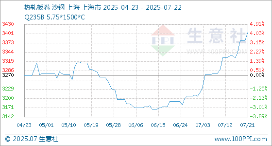 7月22日,生意社热轧板卷基准价为3406.67元/吨,与本月初(3210.00元/吨)相比,上涨了6.13%。