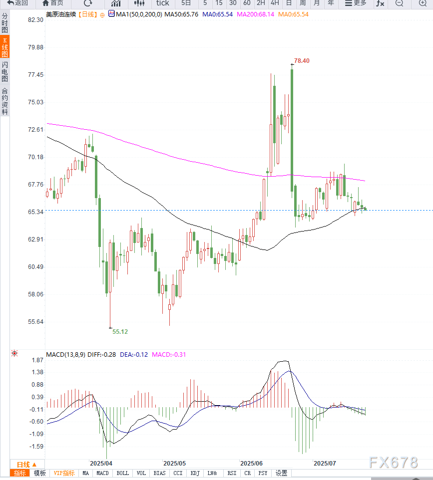 从日线图形来看,美原油(WTI)价格自6月下旬触及72美元高点后持续震荡下行,当前交投于65-68美元区间。布林带收口明显,显示市场动能减弱;