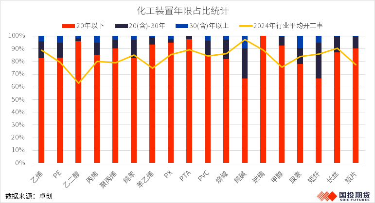 我们对国内在运行的相关装置进行了初步统计,以1995年底和2005年底为分界线,根据装置投产时间划分为30年(含)以上装置,20年(含)-30年及20年以下装置,同时叠加行业2024年的产能利用率情况。