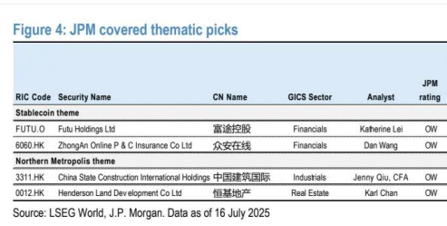 摩根大通发布研报称,将2025年底恒生指数的基准/乐观/悲观目标上调至13,000/14,000/11,000港元,对应回报率分别为2%/10%/-14%。首选股包括友邦保险(01299)、中银香港(02388)、银河娱乐(00027)、香港交易所(00388)、领展房产基金(00823)和创科实业(00669)。港股上半年表现强劲,2025年上半年创纪录的股票回报率和融资活动迎来了温和的经济扩张和EPS上调。主题选股机会重点关注稳定币牌照发放、香港北部都会区发展以及本地高股息股在低收益率环境下的吸引力。