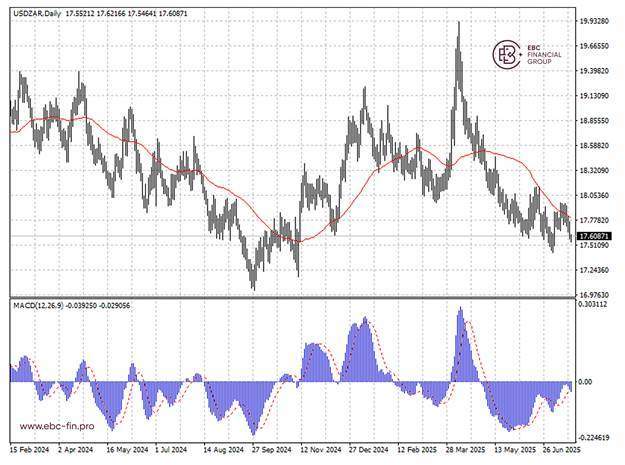 考虑到MACD出现明显背离,南非兰特的反弹可能陷入停滞一会儿。尽管如此,在17.8附近的50日移动均线应该会继续提供支撑。