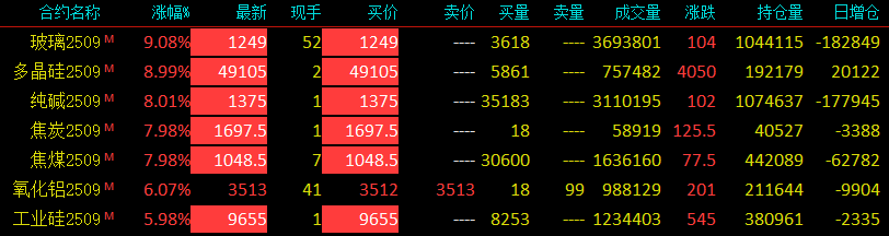 7月22日,国内大宗商品市场迎来罕见涨停潮。截至收盘,玻璃、纯碱、焦煤、焦炭、工业硅、多晶硅六大品种主力合约均强势封于涨停板。