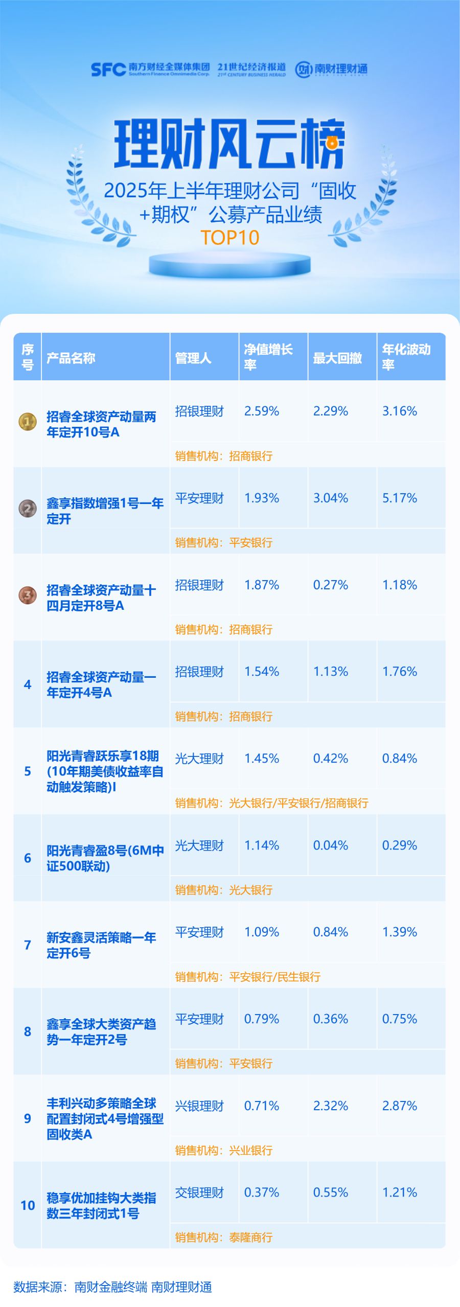 南财理财通数据显示,在理财公司“固收+期权”公募理财上半年业绩榜单中,5家理财公司产品上榜。其中,招银理财“招睿全球资产动量两年定开10号A”、平安理财“鑫享指数增强1号一年定开”和招银理财“招睿全球资产动量十四月定开8号A”位列前三,上半年净值增长率分别为2.59%、1.93%和1.87%。