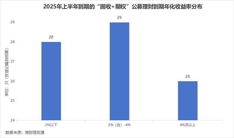 仅从上半年来看,“固收+期权”理财平均收益水平并未较普通的“固收+”产品更有优势。南财理财通数据显示,2025年上半年理财公司合计到期83只“固收+期权”公募产品,算术平均到期年化收益率为2.64%。其中,26只产品到期年化收益率在4%及以上,挂钩标的主要为中证1000指数、黄金。不过,小众挂钩标的产品也有较为亮眼的表现,如华夏理财“跃盈封闭式42号(伯克希尔哈撒韦B类股看涨鲨鱼鳍)”到期年化收益率约5.72%。