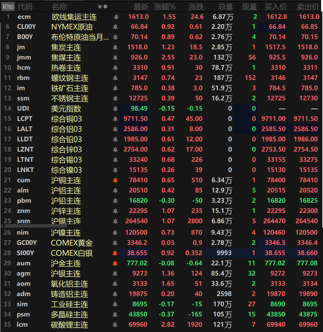 此外,碳酸锂主连涨2.82%,多晶硅主连跌0.37%,工业硅主连跌0.17%,欧线集运主连涨1.55%报1613。