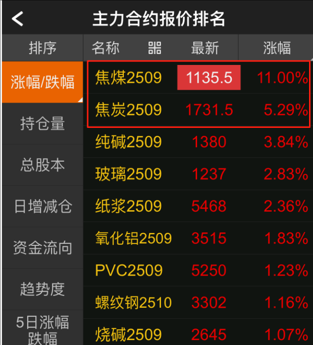 7月22日晚间,焦煤主力合约夜盘涨停,收涨11%,报1135.5元/吨,已连续第二个交易日涨停。焦炭涨5.29%,纯碱涨3.84%。