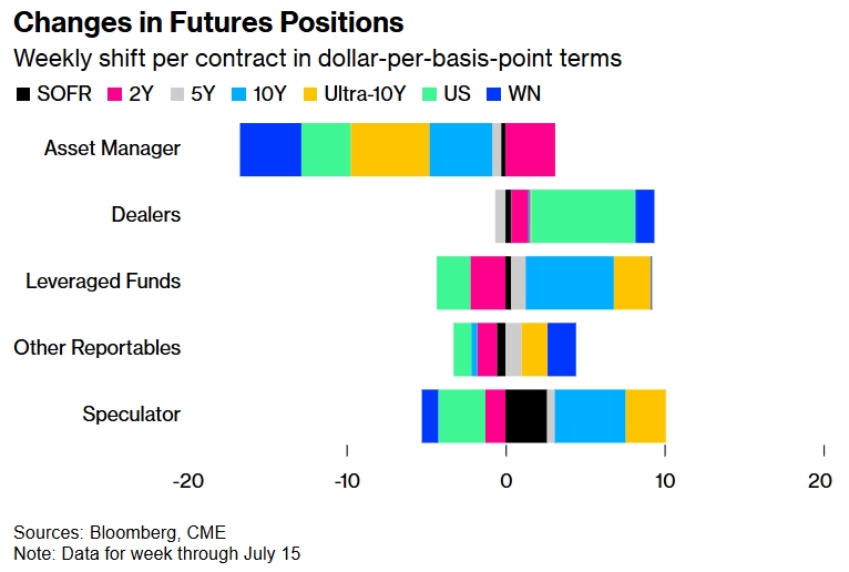 根据美国商品期货交易委员会(CFTC)的数据显示,截至7月15日当周,资产管理机构在多数美国国债期货合约上的净多头仓位出现减少,尤其是从5年期到超长期国债(Ultra Bond)的多个期限产品。其中,仅这类减仓操作对应的市场利率每波动0.01%(即一个基点),其持仓市值的变动规模就合计达到约1.64亿美元。具体来看,Ultra10年期和普通10年期国债合约的减仓最为明显,分别相当于约5000万和4000万美元的持仓价值对一个基点利率变动的敏感度。