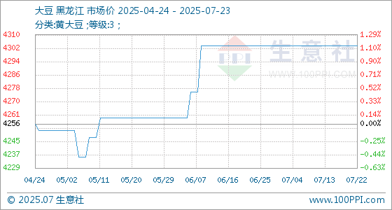 7月23日,生意社大豆基准价为4304.00元/吨,与本月初持平。