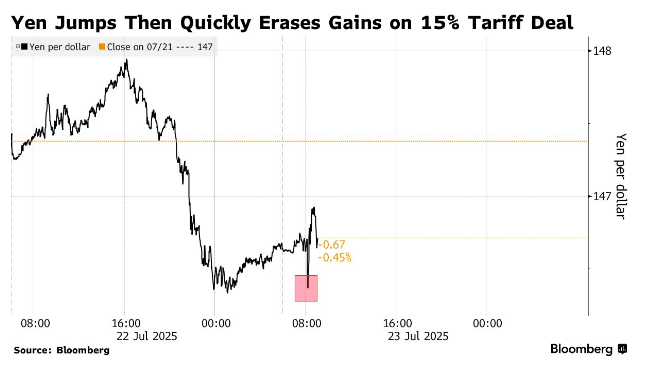澳大利亚联邦银行外汇策略师Carol Kong分析指出:“尽管涨幅转瞬即逝,但日元在关税协议公布后的短暂走强,反映出市场认为15%的关税税率对日本而言已是相对理想的结果。随着贸易协议落地,市场焦点将重新转向日本财政前景,而国债和日元进一步走弱的风险正在加大。”