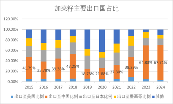 从加菜籽主要出口国来看,出口占比较高的分别为中国、日本、墨西哥和美国,且近两年来加菜籽出口到我国的占比也明显提升,表明中加贸易关系对后续加菜籽的出口情况也有着至关重要的影响。主要贸易国之间的摩擦,可能引发连锁反应,促使全球油菜籽供应链进行调整,各国可能寻求分散风险,减少对单一来源的依赖。据路透社7月16日报道,澳大利亚农业行业知情人士透露,中国可能与澳大利亚达成协议,允许澳大利亚供应商试验性地向中国运送油菜籽货物,中澳之间的油菜籽贸易有望得到恢复。