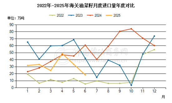 据海关数据显示,2025年6月菜籽进口量18.45万吨,较上月33.55万吨减少15.1万吨,环比减45.01%,较上年同期60.88万吨同比下降69.70%。2025年1-6月菜籽累计进口190.8万吨,较上年同期累计进口总量的242.40万吨,减少51.60万吨,同比减少21.29%。