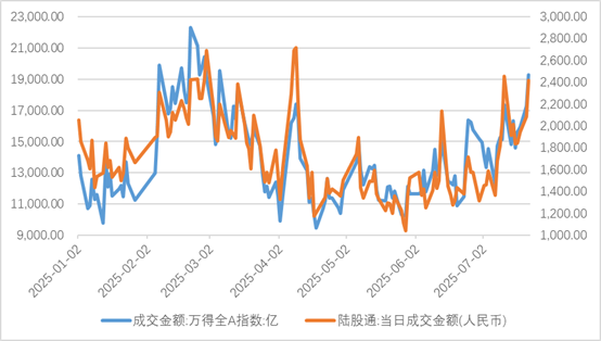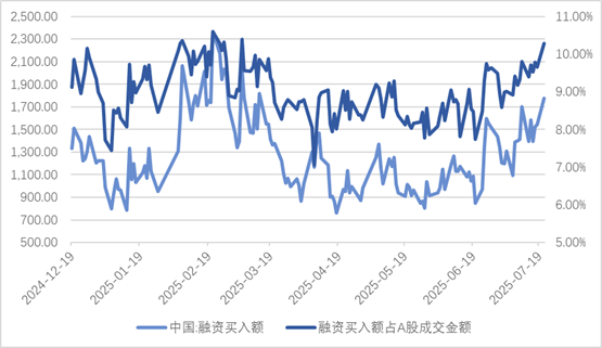 中共中央政治局将于7月底召开会议,为下半年政策走向定调。市场普遍认为,会议将延续扩张性政策基调不变。同时,促消费、稳股市楼市、反内卷、发展新质生产力也依旧会是下半年的工作重点。此外,市场也预期会有新增量政策出台。在政策预期推动下,市场增量资金加速进场,全体A股成交金额连续四个交易日增加;陆股通成交金额连续两周高于9000亿元;融资买入金额连续两周高于7000亿元。