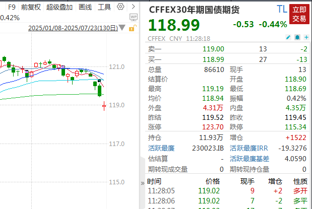 截至发稿,30年期国债期货跌0.44%,报118.99元。自7月初以来,该国债期货累计跌幅接近2%。