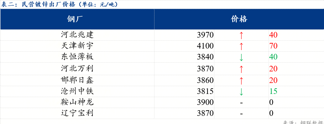 今日北方民营钢厂镀锌出厂指导价在3815元/吨-4100元/吨。