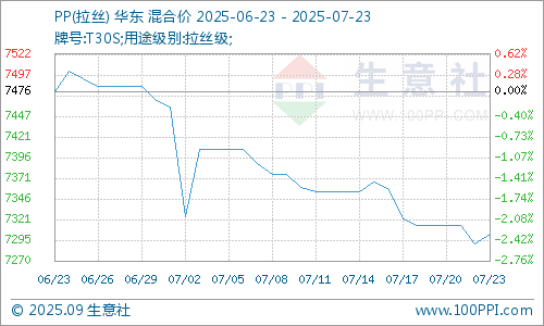 据生意社商品行情分析系统显示,近期国内PP市场行情震荡,部分牌号产品价格涨跌互现。截止7月23日,国内生产商、贸易商拉丝主流报盘价格在7303.33元/吨左右,较7月初价格水平涨跌幅-2.06%。
